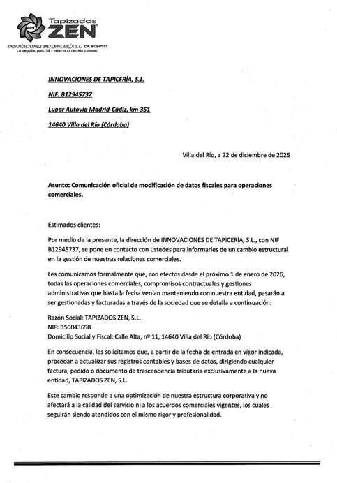 Nuestro proveedor TAPIZADOS ZEN nos informa de que el pasado 1 de enero actualizaron sus datos fiscales, operando desde esa fecha a través de la sociedad TAPIZADOS ZEN, S.L. Descargar comunicado.